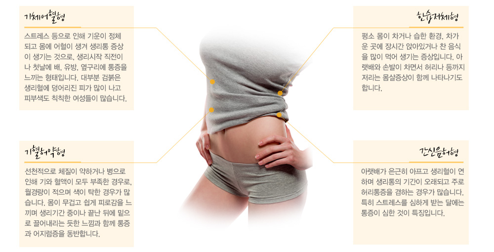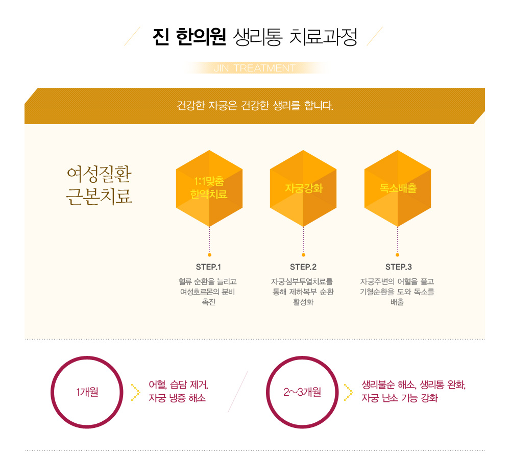 무엇보다 이러한 한방에서의 생리통 치료는 결과적으로 자궁의 혈액순환을 돕고 자궁 내의 불순물들을 제거하여 혈류를 정상화시키고 여러 가지 호르몬의 분비에 영향을 줄 수 있는 내분비 계통을 정상화 시켜 자궁내막증·자궁근종과 같은 부인과 병증의 근본 원인을 해소시키는 중요한 치료입니다.