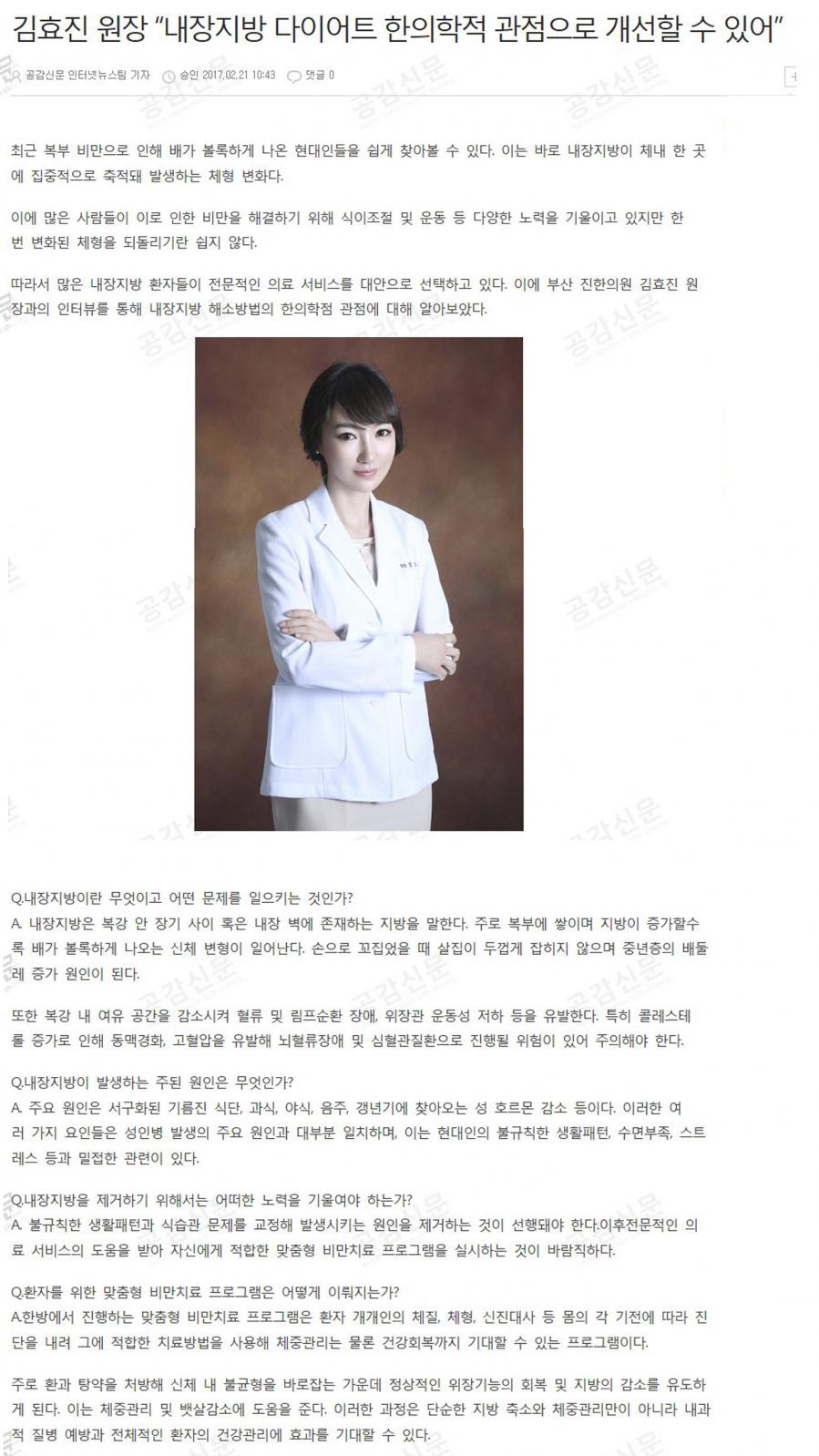 24 | [공감신문] 김효진 원장 `내장지방 다이어트 한의학.. | | 2017.02.22 | 23,015 |