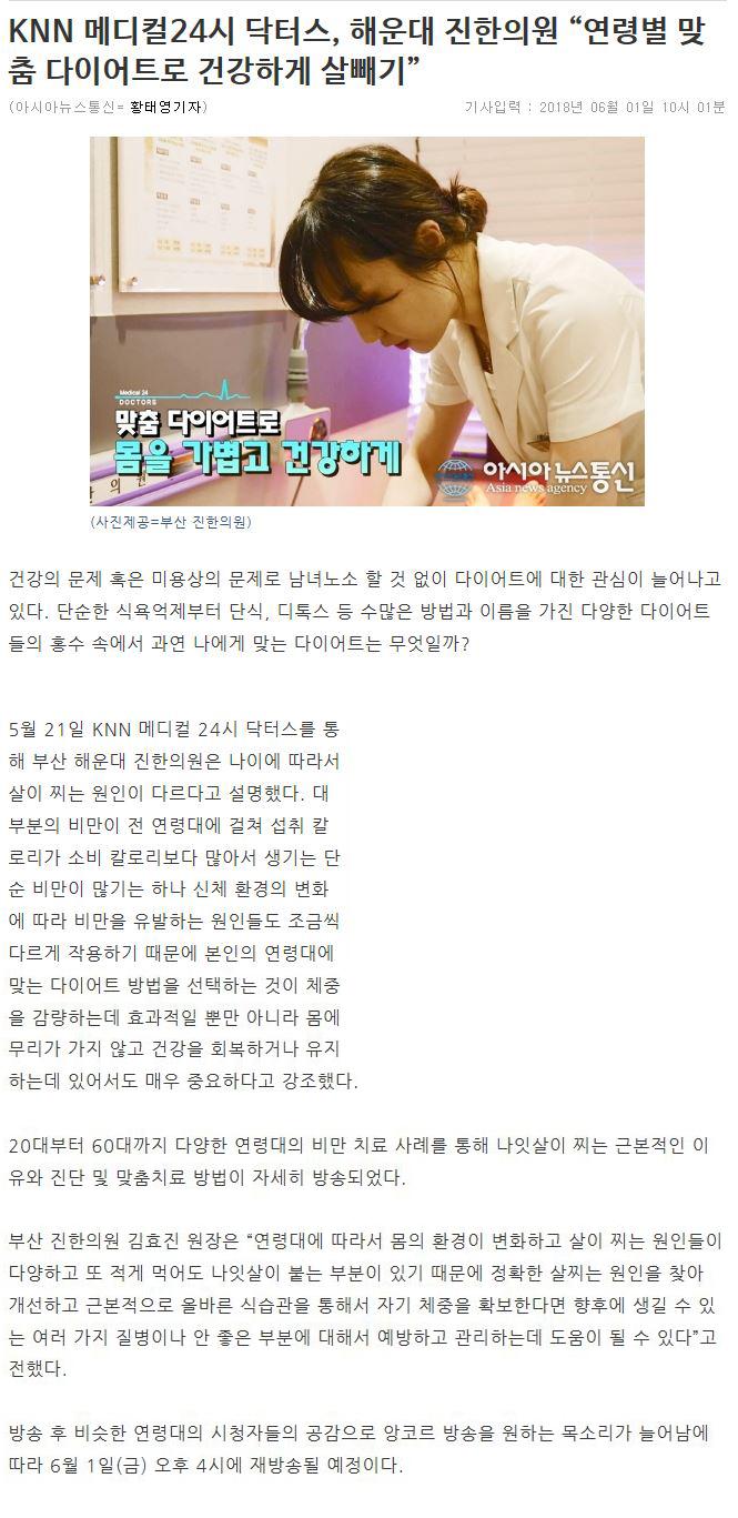 34 | [아시아뉴스] KNN 메디컬24시 닥터스, 연령별 맞춤 다.. | | 2018.05.21 | 21,382 |