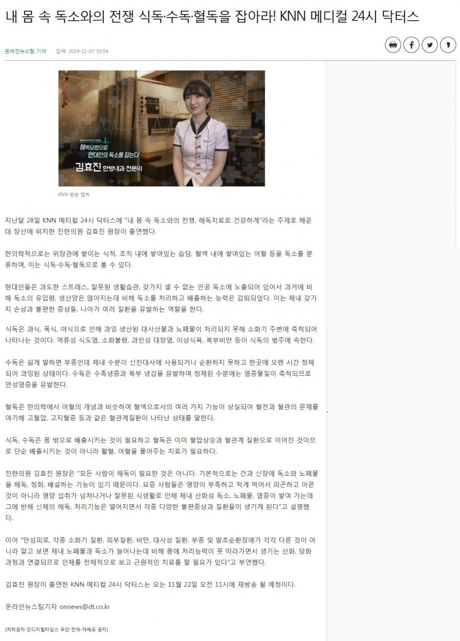 44 | [디지털타임즈] 내 몸 속 독소와의 전쟁 식독 소독 혈.. | | 2019.11.11 | 28,698 |