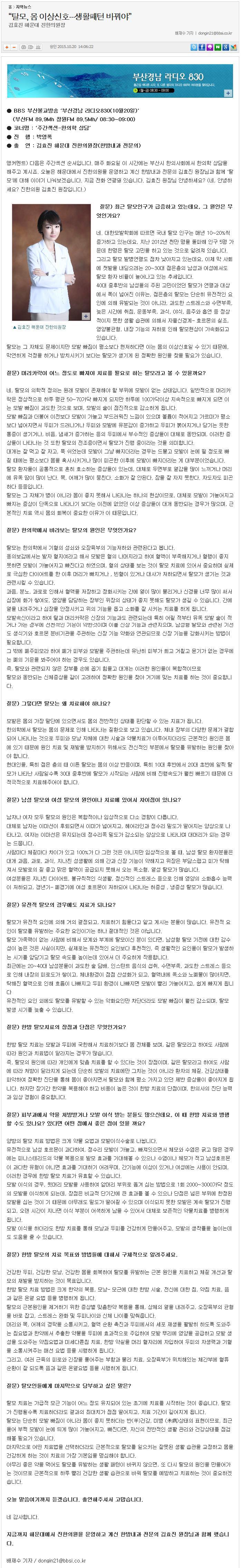 9 | [BBS 뉴스] "탈모, 몸 이상신호.....생활패턴 바꿔야" | | 2015.10.20 | 59,121 |